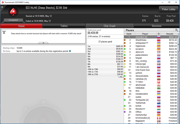 Всем привет! Вести с полей WSOP в Сочи. Вчера удалось пролезть во второй день в Мейн Евенте по 1100, начну следующий день с 16бб. В конце дня сыграл не нужную раздачу против "дерзкой девчонки", поставил 4 бет на её 3 бет с СБ, она вколила и донкнула пол своего стека с 49о на доске 33Д с фд. Вот такой нынче оффлайн, видимо я слишком читаем, сдался как нитовка со своим Ах. Из самого приятного, вчера представитель ITCFond Дмитрий "hdcore", поделил в топ 4 Монстер стека, за что получил около 28000 у.е., с чем его от всей души поздравляю, отличный результат, для человека впервые приехавшего на столь крупное событие в оффлайне.