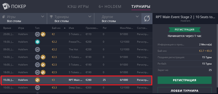 15:30 МСК - Предфинальный сателлит RPT Main Event Stage 2 с байином 3 евро | 10 гарантированных мест в финальный сателлит