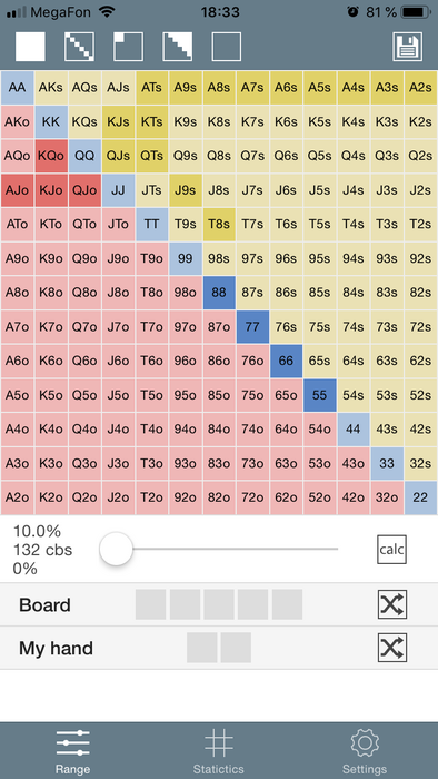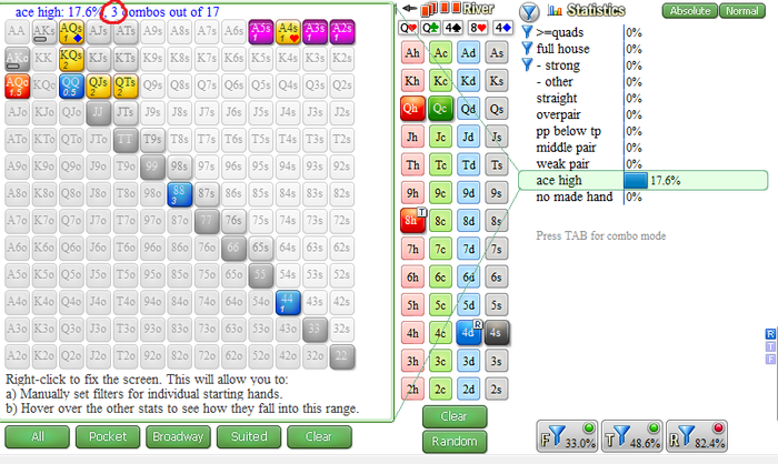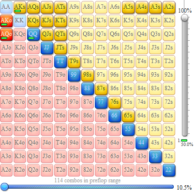 Simka, Ну как я и сказал, границы рейнджа будут плавать, к тому же опен рейзер изначально подколил мой сквиз и дал ему оддсы. Да и если я буду рейндж сужать, то мне там еще больше жопа, потому что уйдут карманки и коннекторы, Qx особо никуда не денутся.