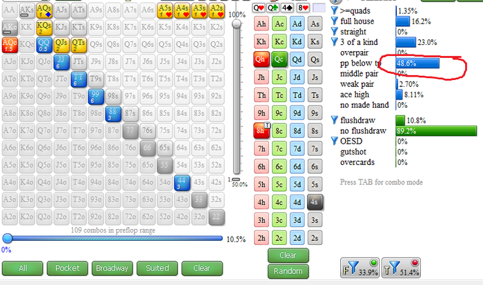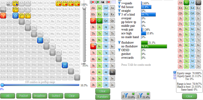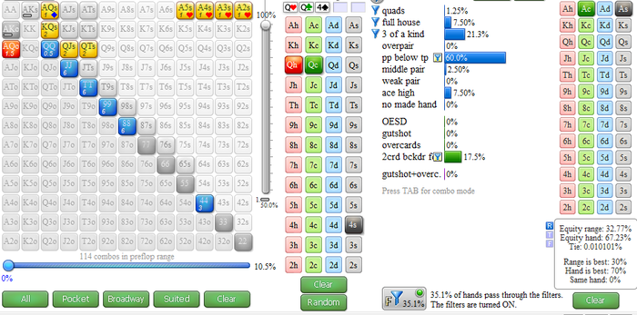 Итак, наш опп колд-коллит на БТН против МП. Его 3бет против этих поз 4, колд колл 13. После чего получает сквиз от меня и колд-коллит его. В таких ситуациях рейндж оппа будет довольно-таки прозрачным и состоит из карманок, мастных коннекторов и некоторый мастных Ах или такой Границы этого рейнджа будут немного разные от игрока к игроку. Выпадает борд Ставим цбет 1/3, он колл. Сильной телефонией опп не занимается, так что допустим что он не будет на флопе гнаться за маргинальными бекдорами, а коллить будет только гововые пары и бекдоры на натс стриты и флеши или комбо-дро ну и конечно же Qx