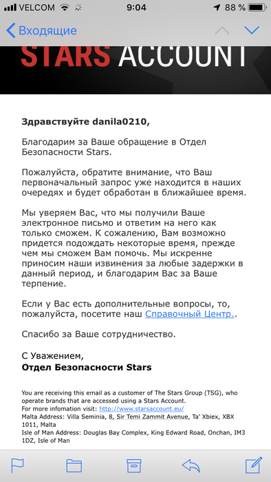 Тут не обманули. Сотрудник и правда проверил документы, но пришло не долгожданное письмо с надписью: "ваш аккаунт снова доступен для игры!", а письмо с темой: "Ваш аккаунт заблокирован!". Дело в том, что пока я пытался найти лайв чат - пользовался различными ВПН-сервисами, что старзы восприняли как попытку взлома моего аккаунта. В связи с этим дополнительно запросили селфи с паспортом, попросили сменить пароли на почте и самом аккаунте ну и т.д. Благо, после того как я выполнил все их требования, в течении двух часов пришёл ответ о том, что мой аккаунт разблокирован. На данный момент все функции на аккаунте доступны