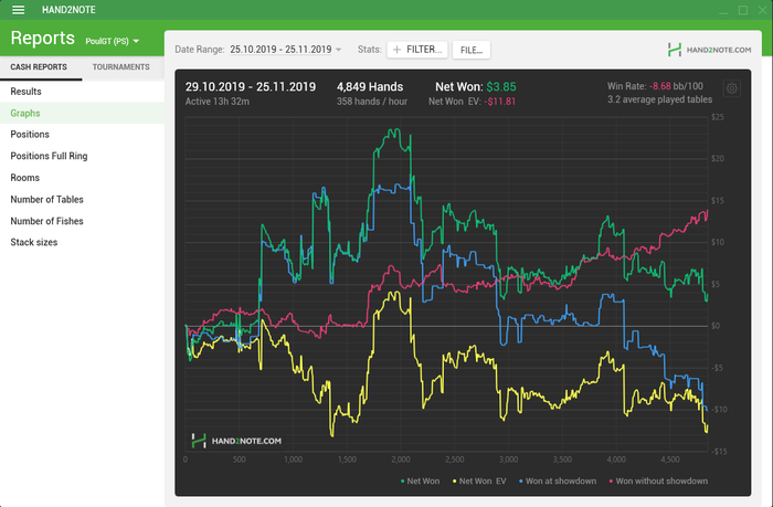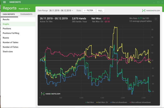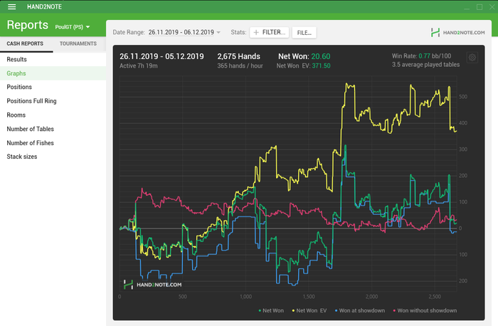 Всем привет! Потихоньку поигрываю теперь по стратегии, сменил её 26 ноября, убрал коллы почти совсем (глупая конечно была ошибка :) теперь это вижу). Играю только те ситуации, в которых уверен. Выкладываю результаты смены стратегии, конечно выборка маленькая, но стал себя уверенно теперь чувствовать на NL2. Пару дней назад отхватил сессию в минус 8 долларов на NL5, очень рад этому, узнал много нового об этом лимите, там есть классные лузовые реги, которых никогда не видел на NL2. Вошел в режим дня, теперь себя отлично чувствую, выполняю ежедневные привычки. Разбираю непонятные моменты, в общем по чуть-чуть двигаюсь :) Убеждаюсь, что главное упорство и грамотный распорядок дня, который даёт много лишней энергии и почву для дисциплинированного выполнения дел.