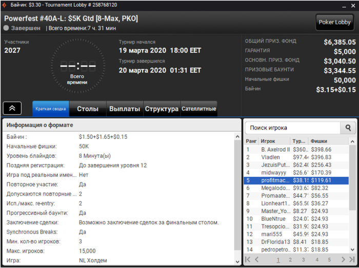 В 55-ом наколотил 110$ баунти, и начиная с 240 места тянул время, за каждые 15 чел давали по 4$, бакс подрос это вдвойне приятно, дилер решил поглумиться надо мной и начал раздавать в течении часа один мусор, но я пересидел еще 100 чел, а это 8 пейджампов и заработал 215$. В лютейшей килополяне малютки поймал дипран, занял 5-е место, последняя раздача на финалке грязь, но результатом доволен.