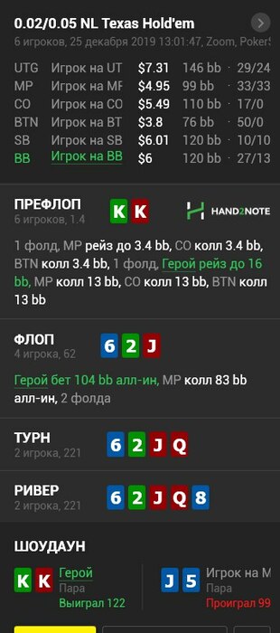ФЗ нам рисует ~ 36% эквити, против диапа продолжения оппа JJ+, A5s..A2s, AKs (дрова) Основано на предположении для ситуации, когда МП окрывает ~20% , мы трибетим ~ 10% и получаем 4бет порядка ~5%. ( безотносительно лимита )