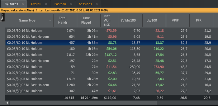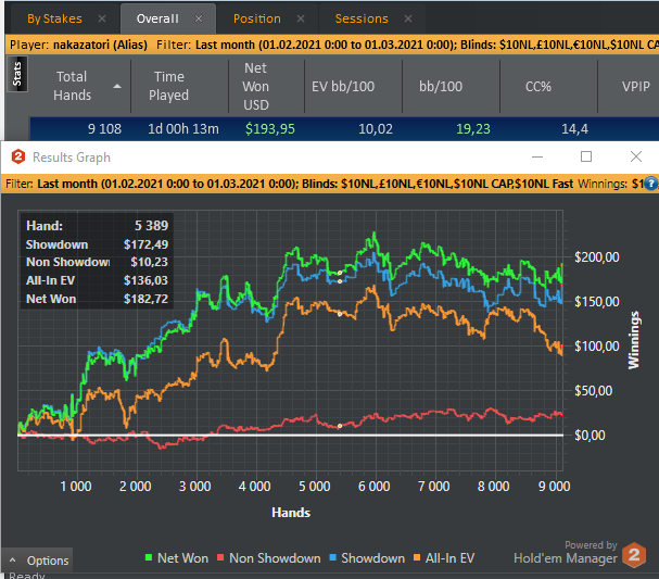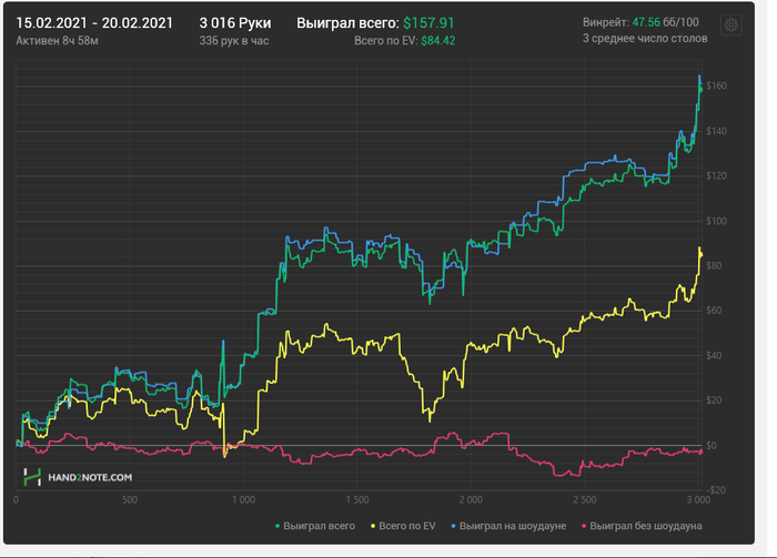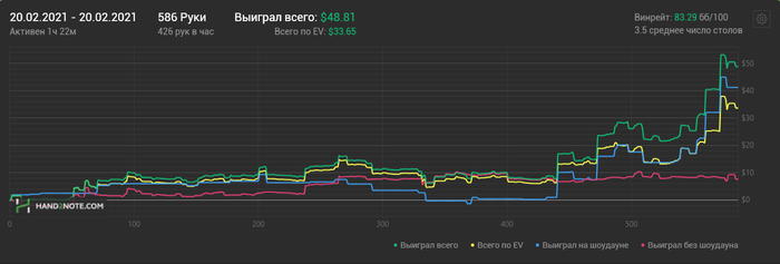 Все таки мне заходило хорошо, да и играл я в целом (кэш и мтт) сносно. Стараюсь не усложнять, где то давить. Мало вижу людей у которых красная в 0 не говоря уже о том что в плюсе (темболее на микролимитах). Постоянно возникают споры, это признак хорошей игры или нет, я хз. Правильно ли я играю? Хз. Возможно что нет. Приносит ли мне это денег? Пока да. А дальше посмотрим.