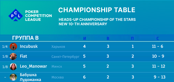 Еще один герой весеннего SCOOP, а точнее, чемпион одного из событий за 1k$ (приз более 150k), топ-тренер ФанфармаFiat , представляющий в чемпионате ХАД собственного сочинения Fiat HUD Hand2Note , благодаря своему классу и опыту одержал уверенную победу над Бабушкой Лудоманкой, единственной из представительниц прекрасного пола после перезагрузки чемпионата. Она оказалась в группе с 3-мя очень сильными соперниками и дала настоящий бой, одержав победы в 2-х матчах, особенным стал матч против Incubusk'а, в котором она проигрывала 0-2, но смогла победить, да и победа над завсегдатаем ХА СНГ Лео Мановаром дорогого стоит. Ольга - ты молодец!