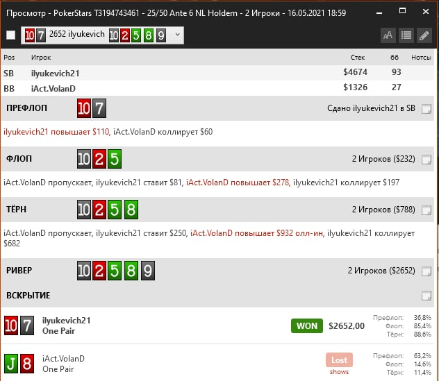 В 4-й игре я 3 раза ловил доперы с флопа в больших банках. Правда не всегда оказывался старше, раз поехал против сета и удвоил Воланда. Сразу я набрал преимущество по фишкам где то в 4-5 раз, но потом сравнялись. И по итогу зарешало выставление АТ>А8 в стенках 20бб.