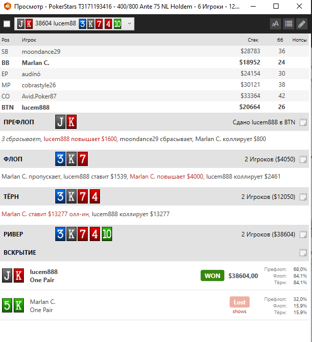 McSim @ 12.04.21lucem888, по последней раздаче - просто по ТП шпарит не думая. Адекватных, по-настоящему, оппов мало на таких уровнях.
