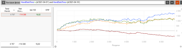 За 2 недели сыграно почти 7 000 рук. Я понимаю, что это очень мало, но больше играть пока не могу себе позволить. При том, что график и винрейт выглядят вроде бы прилично, по БР небольшой минус = - $16,70. Ну как небольшой... почти 25%... ROI находится на прежней отметке - 30%.