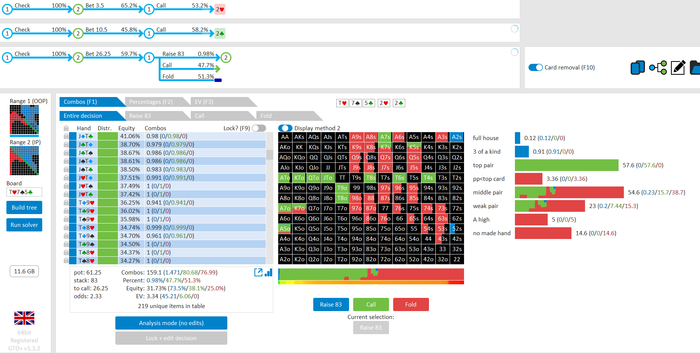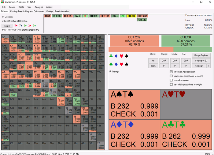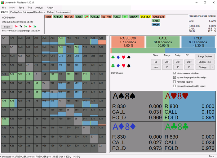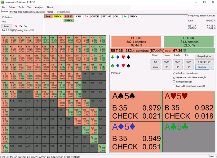 Откуда такая инфа, у меня есть доступ к PioSolver на отдельном сервере, прогнал только что ситуацию BBvsBTN SRP, текстура , задал одни и те же префлоп диапазоны, сайзинги и т.д., вот что получилось, GTO+ ставит цбеты по улицам с такой частотой - 65%/45%/59%, PIO же ставит с такой частотой - 67%/44%/62%, для коллера все аналогично, просто сравни 1-ый и 5-ый скрин, это диапазон с которым коллер выходит на ривер, в первом примере GTO+ на ривере фолдит 51% ренджа и рейзит 1% (всего 159 комб), а во втором PIO выходит на ривер со 165 комбами, фолдит 48% ренджа и рейзит также 1%, по сути отличий вообще практически никаких нет, даже если посмотреть по матрице рук на 1-ом и 5-ом скрине, то все совпадает практически с 99% точностью, поэтому не знаю откуда ты берешь такие умозаключения, но тебе возможно стоило бы самому сначало на практике сравнить результаты этих двух солверов, чтобы писать об этом
