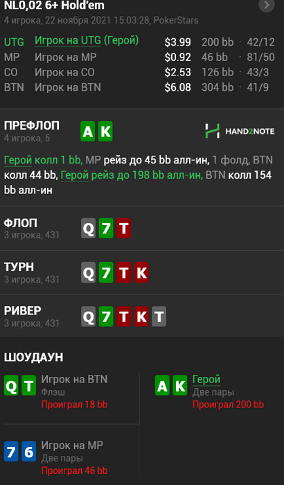 х2н пишет, что у батона QTs 36% шанс, а у меня с AKs 35% ? как так то AKs слабее QTs? и колл от батона здесь верный?