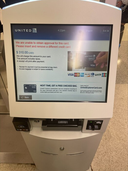 Регистрация двух больших чемоданов, 1 маленького, 1 теннисной сумки и гитары по правилам авиакомпании стоит 300 далларов(вынь да полож). Что делать, приходится платить. Вставляем карту – не работает. Вторую – тоже. Третью – тоже. Делаем СПЕЦИАЛЬНУЮ карту в автомате рядом, кидаем туда 300$, стоим еще раз в ОЧЕРЕДИ и... и нихуя ничего не происходит. Карта не работает.