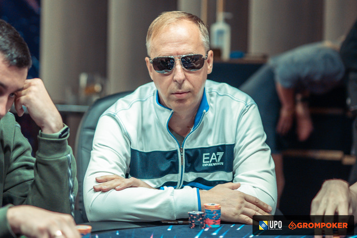 Виталий Фокас дожил до этой стадии турнира со стеком всего 74,000. Решил запушить из ранней через весь стол и получил колл от Андрей Грильберга на ББ. Колл творческий, скорее, сделанный в погоне за нокаутом.