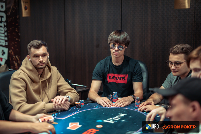 Не самые глубокие стеки у ребят в турнире, менее 30ББ глубина. Андрей Кара выставился в классической монетке против Кирилла Мельника примерно по 300,000.