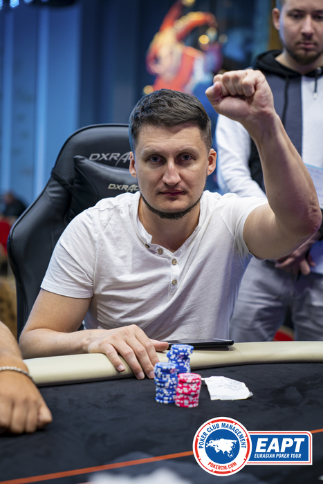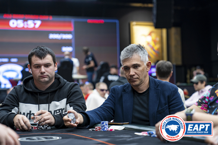 Через пару раздач выставление всё же произошло: Максим Сковородник с туз-король удвоил Владимира Екшибарова с парой восьмёрок. Поставили тысяч по сто и по итогам раздачи поменялись стеками.