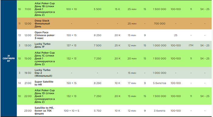 Прямо сейчас стартовал очередной флайт Altai Poker Cup по 5 500 рублей с гарантией 1 500 000 рублей, в котором выгодно играть все возможные входные дни, потому что в День 2 переходит сумма всех стеков, набитых игроком ранее. В 15:00 и 22:00 начнутся ещё два флайта этого турнира.