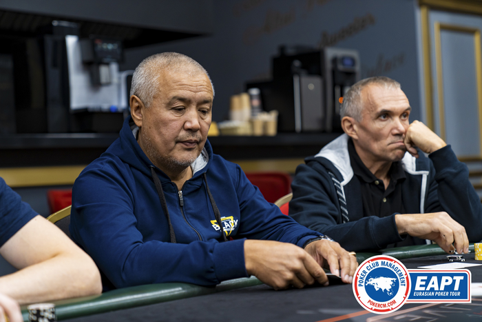 Сергей Иванов со стеком 140 000 открыл с первой 20 000, Мурат Имансакипов подколлил на баттоне со стеком чуть меньше, Дмитрий Шкуропат в третий раз поставил олл-ин. Иванов долго думал, но всё же выкинул; Имансакипов думал ещё дольше, но тоже сдался.