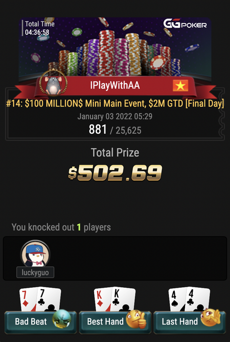 Мне доехали: и флеш и стрит и две пары с тузом, которого у него явно нету, так как Ах руки он бы запушил префлоп