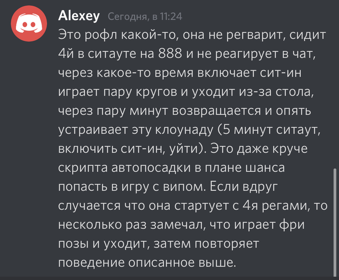 Ну и когда ты сидишь регваришь, а кто-то открывает новый стол или когда ты не садишься за стол потому что у тебя много экшна и ты не готов играть регвар, а кто-то может позволить себе нарушить правила и просто сидеть в ситауте 3м, и получается просто режет твоё ожидание, это настоящее добродушное и поддерживающее отношение к окружающим ?