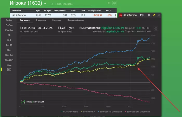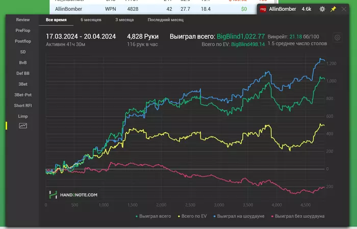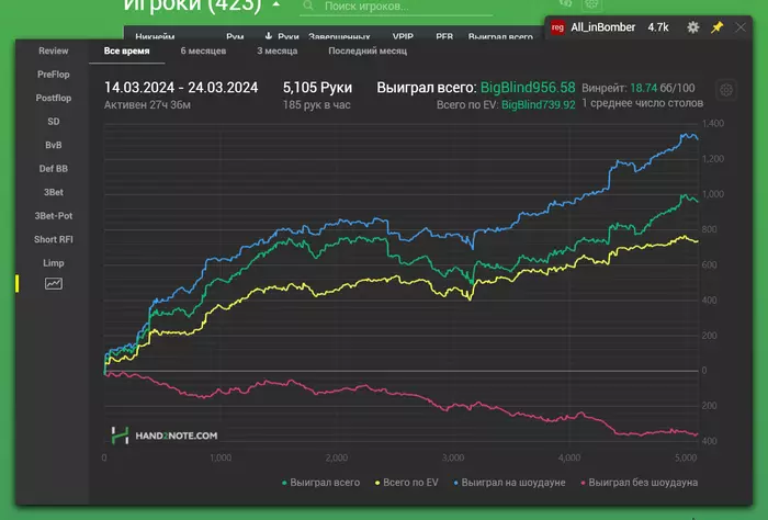 Оказывается, мой ЛАГ стиль даёт мне 30-33% РОИ, а играя турбины пушфолд наступал раньше чем я привык. Меньше постфлоп игры - меньше моего преимущества! А в пуш/фолде ребятам напрягаться и не надо, за них карта играет, вот и все дела, моё преимущество нейтрализовано.