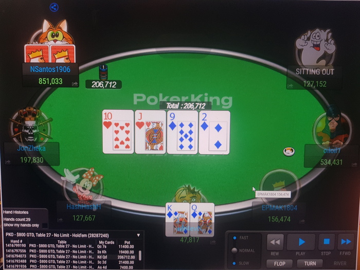 Pokerking такое говно ..... Клиент отстойный , игры мало так еще не дал огрызок доставить , изобразил дисконнект и секунд через 30 скинул мои карты , хотя там таймбанк был на несколько минут....