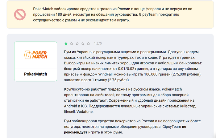 PokerMatch заблокировал средства игроков из России в конце февраля и не вернул их по прошествии 180 дней, несмотря на обещания представителей и собственные внутренние правила, скорректированные после 24 февраля. Формально рум продлил сроки “дополнительной проверки службы безопасности” до 365 дней.