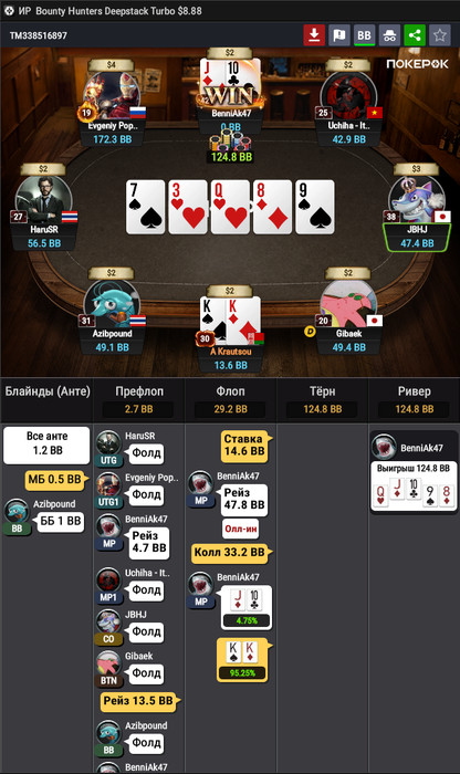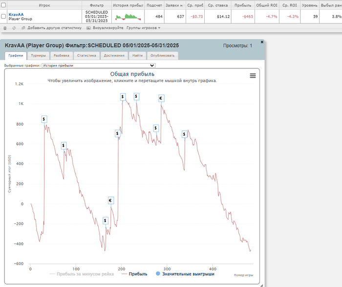 Отыграл 32 турнира на АБИ 14, из них 5 ре ентри. Загрузил 448 - выгрузил 179. Профит -269.