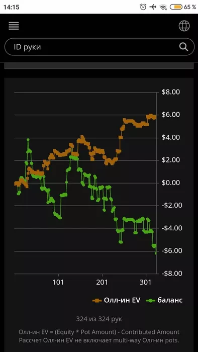 За 324 руки меня размотали. Самое забавное, что проиграть то я должен больше $10, так как мне ещё из котелка насыпало ~$2. Почему на графике -$6 для меня загадка.