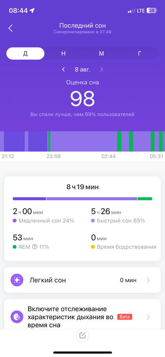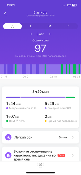 Предсказуемая ритмичная рутина: с 21:00 до 05:30. Трекер показывает, что я вхожу в топ 1% по качеству сна.