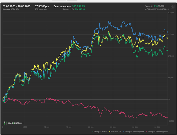 Если абстрагироваться от резалтов, то я оч доволен тем, как прошел месяц. Я бы даже сказал, что я более менее хорошо играл не смотря на ран в целом, за что в целом могу себя похвалить. Сыграть 50к рук в месяц, провести точно больше 30 часов за теорией, соблюдать режим + дисциплину и не поехать кукухой, я считаю это победа! Было бы заебись привить себе такое в будущем. В общем вывод из этого всего, что менталка пиздец как важна,чтобы показывать А игру, покер все таки лонг дистанс гейм и наверное хорошо, что я переживаю это сейчас, прокачивается стрессоустоичивость и в будущем в определенных спотах будет проще, как жизненных, так и покерных.