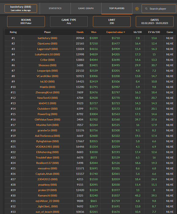 В этом месяце сыграл ~25к рук на 500, остальное 200, нл200 играл только на 888.