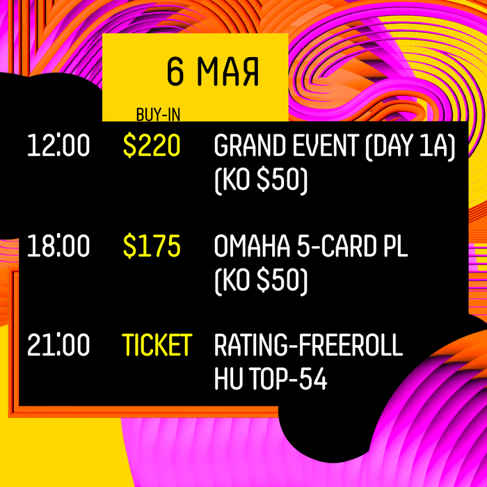 Второй день майской серии мы почти полностью посвятим турниру $220 Grand event. День 1А начнем в 12:00, отыграем 16 уровней и закончим около 20:45.