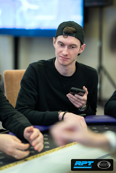 В противоположном углу зала Эмиль Магеррамов с малого посквизилл 8,300 в троих, с СО Алексей Веселов единственный со словами "Вот я в твоем стиле сейчас попробую, Эмиль", заколлировал, оставив за спиной 7,500. По флопу Веселов докинул остатки с монстр-дро.