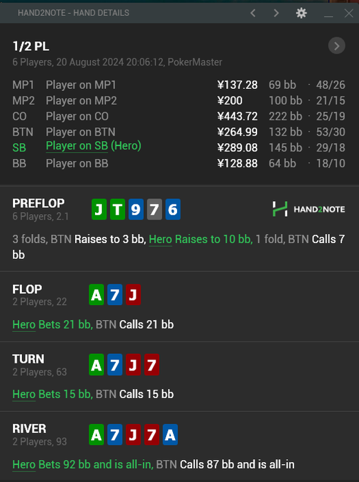 поэтому оппонент по такой совокупности факторов может защищаться довольно широко, ему достаточно 33% эквити для колла флопа и учитывая наше отсутствие натсов, эти 33% эквити у него будут чаще чем нам нужно, чтобы он фолдил 60% случаев.