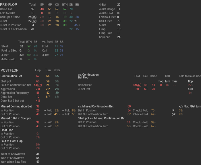 Оппонент открывается лузово RFI 42 55 55, контбет в 3бет потах 75 (высокий), фолд на контбет 38 (низкий).