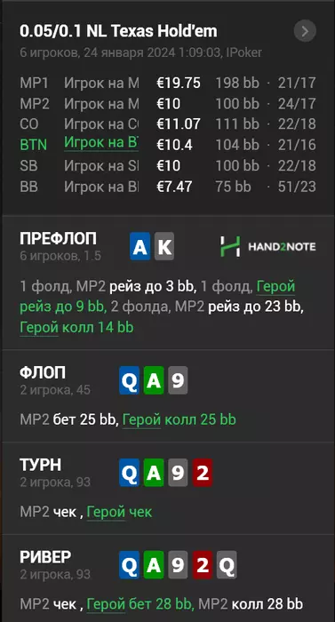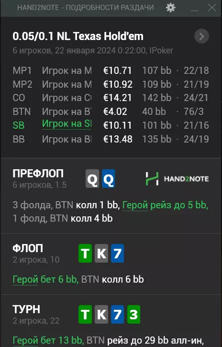 VitalNN, мм... интересная раздачка... настораживает такой узкий 4бет и его сайз на флопе конский... но с другой стороны чек 2 улицы... Q на ривере не очень карта, А слабее может спугнуть если пушить... был был бланк полный на ривере 2-9, то за пуш двумя руками... а так думаю норм небольшая ставка...