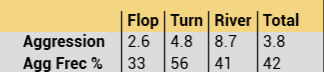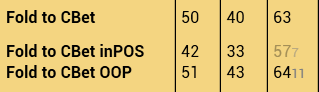 Изучая теорию я натолкнулся на информацию, что надо отталкиваться не от стата "Fold to CBet", а от стата "Any Fold" и это выглядит логично, особенно на тёрне и ривере, ведь есть огромная разница между тем, что я поставил оппу три барреля и он выкинул ривер и тем, что я просто поставил ривер после чек-чек тёрна.