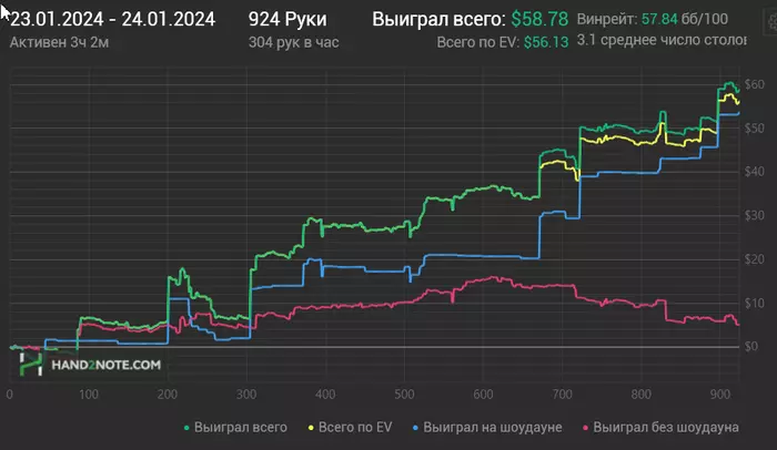 novoros, У меня на него приличная выборка, похоже там рейндж 4-бета АА,КК,QQ и АК через раз. Приличным сайзом кбета он сразу спалился на отсутствие сета, поэтому я сомневался между АК и КК, но по тёрну он АК бы запушил с огромной вероятностью.