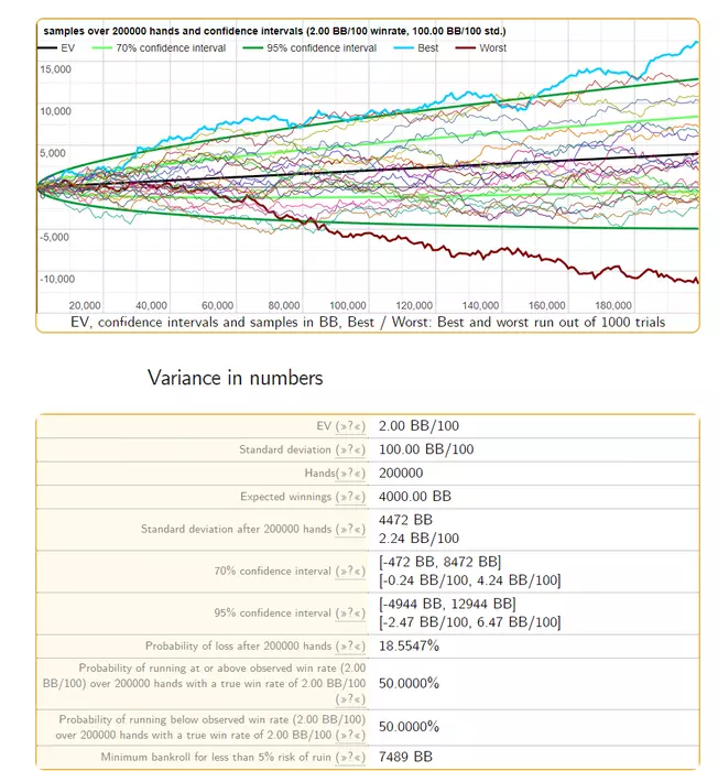 Jeffrey,у меня и в холдеме была просадка в 100би.Один раз за 5 миллионов рук,но была.И это с рейтом 10/100.Есть сайт с моделированием покерной дисперсии,я когда то игрался там.Вот тебе стандартный винрейт в 2бб на дистанцию в 200к.И это не омаха,а холдем.В омахе все пострашнее будет.Видишь сценарий,при котором есть возможность сгореть 100би? И рекомендуемый бр?