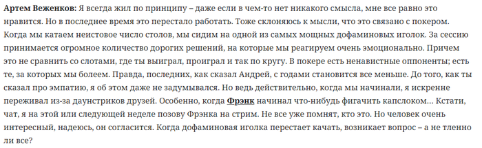 Мы переодически ржем в конфе над адептами «покеру осталось 2 года», но иногда их слова дают пищу для размышлений. Народ обсуждал стрим VeA и stiger’a, где Артем затронул тему дофаминовой иглы: