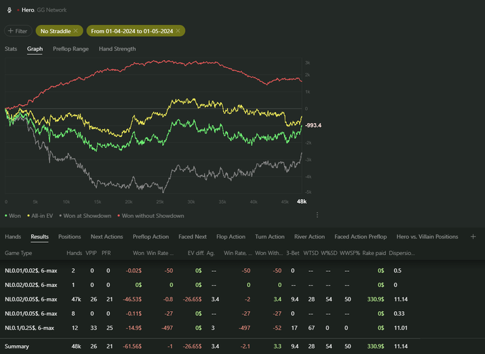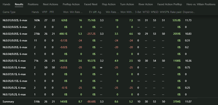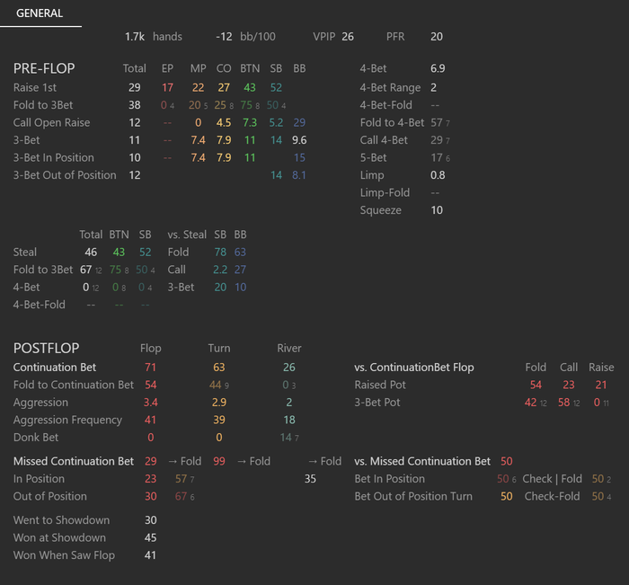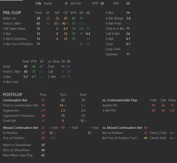 На такой дистанции говорить о чем-либо ещё рано. Думаю, проведу какой-то анализ уже на 10к раздач, там будет видна какая-нибудь тенденция. Пока не очень доволен статами побед на ШД и побед, когда видел флоп. Так как в целом я дохожу до ШД в оптимальных 30% случаев, то думаю, что просто диспа качает немного лодку.
