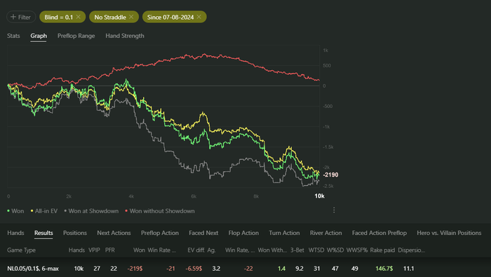 И за крайние 10к рук нл10 я уехал -22 стека с красной в ноль и синей в пол. А так там винрейт был +6.9/100