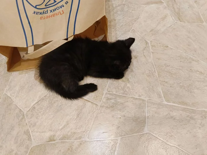В общем спасли животное, притащили к нам и уселись в холле думать, что с ним делать дальше. Оказалась кошка, месяца 2 от силы. Чистенькая, хоть и уличная. Накормили/напоили. Почувствовав себя в безопасности уснула у сына на руках, так и просидели часа 2. Забрать не можем. Свой зверь не привитый. Он у нас из дома вообще не выходит, кроме редкой ветеринарки. Ну и конечно уличную нельзя брать, начитался всякого, много нахвататься можно, а уж непривитому, вообще, смертельно опасно. А так и забрал бы может. Тяжелая была дилемма, но не дал слабину всё-таки, объяснил что к чему детям. На ночь забрал её сыний друг, но там тоже не вариант, у парня аллергия, которая уже дала о себе знать. В общем, задача за сегодня пристроить. Дневник у меня не сильно популярный, но мало ли кому в МСК и рядом нужен 4ногий друг подруга, напишите, организуем.
