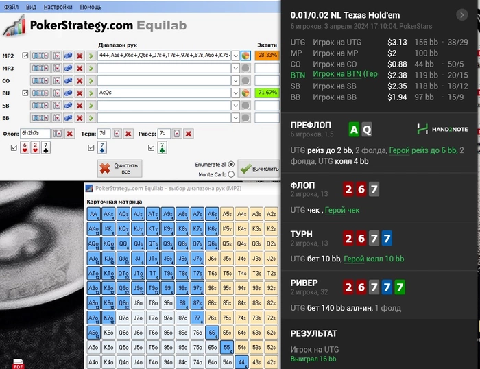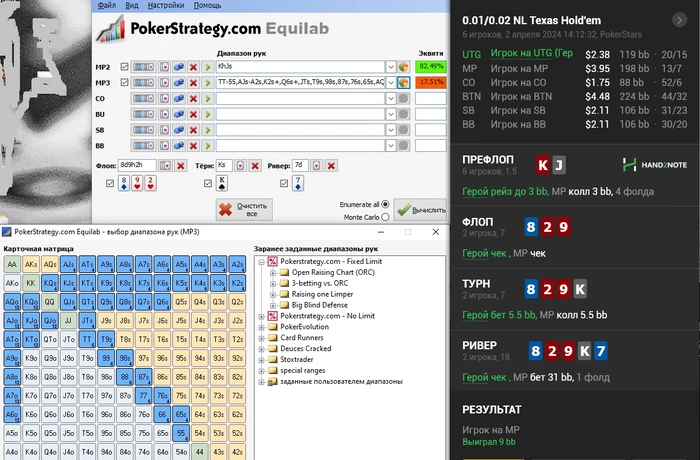 по раздаче с kj..Зачем ты в эквилаб вводишь такой широкий спектр? Ну какие Q6s у оппа со статами 13 на 7 с префлопа? Он нитовей тебя пока что на данную выборку. Я ж говорю... Больше теоретической работы надо, пока совсем с базовой покерной логикой плохо.Убирай те комбы, которые к улице которую ты в данный момент разбираешь, отсутствуют. По раздаче - бет терн и бет ривер. Сайзы выбирал бы средние, без фанатизма. Зачем там чек ривер? Чтобы что? Чтобы он чекнул свои 8икс 9икс и ты проплатил чек колом его доезды в стрит и допер? Но по риверу обычный сайз все равно колил бы, так как на велью может хуже что то ставить