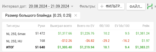 Рейк = 1632$ и выигрыш 1273$. Складываем 1 с другим и получаем 2905. Ну 6$ погрешность. Но, значит, я ошибался касаемо рейка. H2N показывает другие результаты.