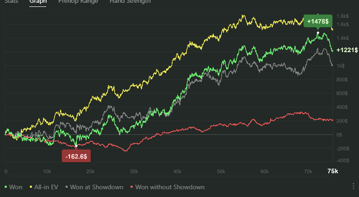 Имеем 75к раздач. 1221$ выиграл. Винрейт 6.5, ЕВ винрейт 8.2. РБ дает 1.5бб/100. Это я уже считал. Ну и график.