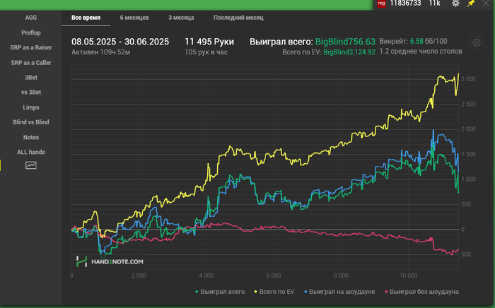 Часто приходилось катать в неоптимальном состоянии еще и раздавали ппц просто.При моем бешеном селекте(81% раздач с игроками с впипом 50%+) я умудрился отыграть в минус по факту, по ев около 4 евбб\100.Учитывая расходы на софт отыграл где-то -10би.Недобор словил дикий,особенно под конец.После выхода из фонда удалил весь софт,чтобы освободить место с ссдшника,а то постоянно не хватало места из-за эмулей.Установил пубг снова и пару дней просто отдыхал.Ездили гулять с детьми и женой.На море сьездили,благо в Корее это недалеко.Даже забыл сделать позорный общий график на память.