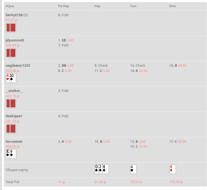И кстати я бы на месте валетов бы сбросил. К выходу червового ривера, SPR уже не блефовый, мы практически ничего не бьем. А я как замечаю, что на флешовый борд, поле чаще оверфолдит.