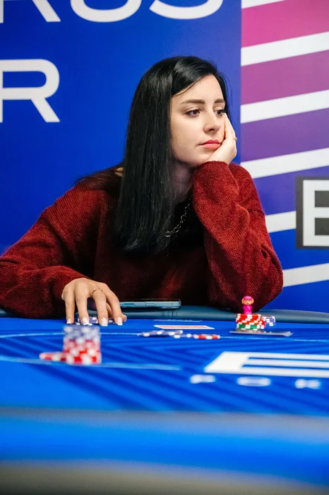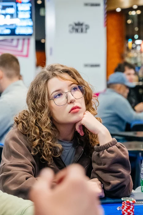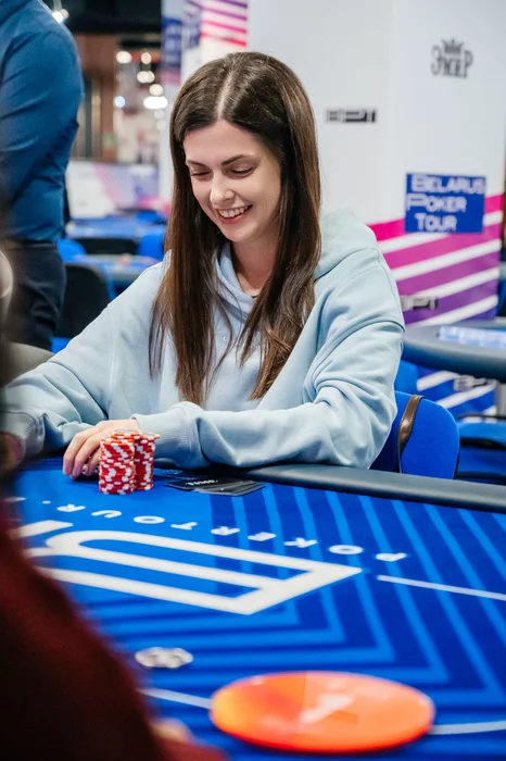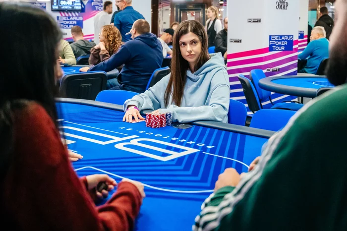 После этого Денис Капустин выиграл у Алины Полегошко крупную раздачу. Зашел лимпом с кнопки, Алина на блайнде чекнула.