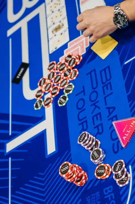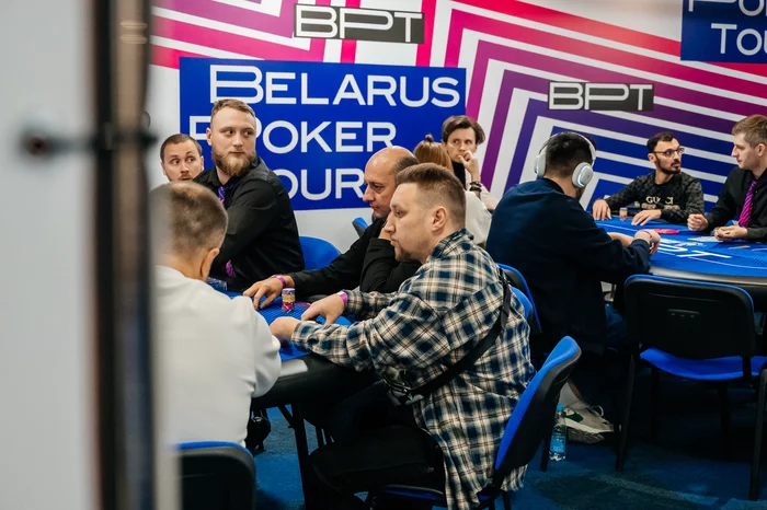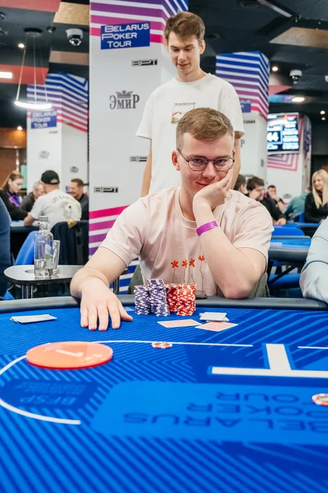 За другим столом Дмитрий Шахов столкнулся с Русланов Бокшицом < . Тузы Бокшица не просто устояли, а ещё и собрали бубновый флеш.